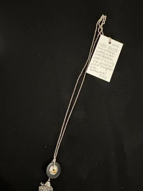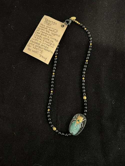 This stunning scarab beetle holds the legend of renewal. Cast from a vintage Czech mold, ca 1920s, I’ve hung it with a circle of faceted onyx and golden hematite for healing. Be well!